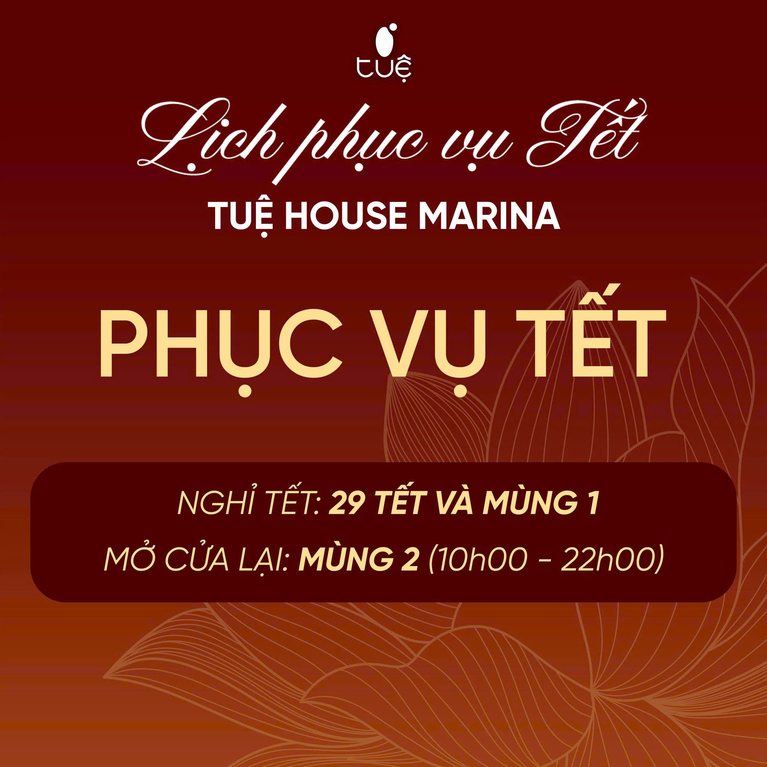Tuệ House Marina sẽ quay trở lại từ Mùng 2 Tết, sẵn sàng chào đón Quý khách với không gian thư thái và thực đơn chay tinh tế cho những ngày du xuân đầu năm.